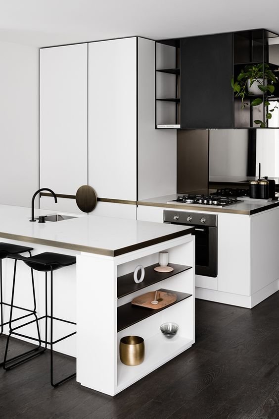 Above we have color delineation with large areas of white contrasted against the smaller black cabinetry area and brown-black flooring. What a statement in its crispness!