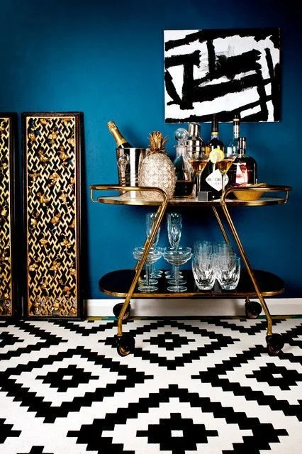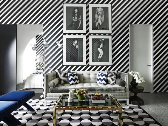 Wow! isn’t this a busy black and white space? We have stripes, circles, chevron and rectangular patterns, black and white art in large print, and a touch of cobalt blue in the seating.