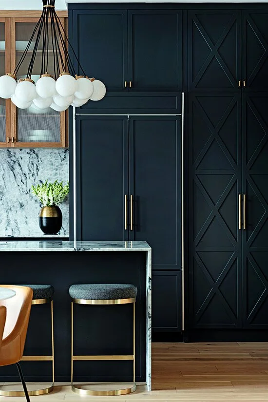 There’s no way around it! This is a black kitchen. It is a bold statement. Touches of gold and wood soften it a bit, but this is an attention-grabbing statement for certain.